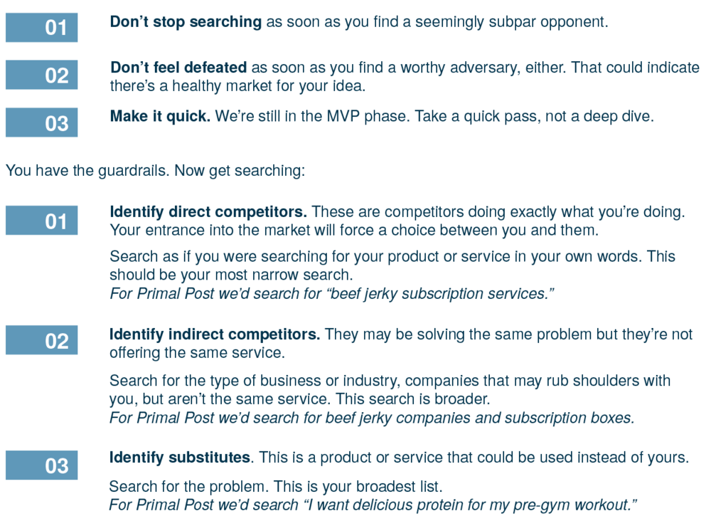 Why do we do it? That was a rhetorical question! We know the answer; it’s to identify the competition. Deploy a similar strategy with your business idea. Prevent a false start by identifying the competitive landscape early in the process. Dedicate no more than 30 minutes by following these three rules: